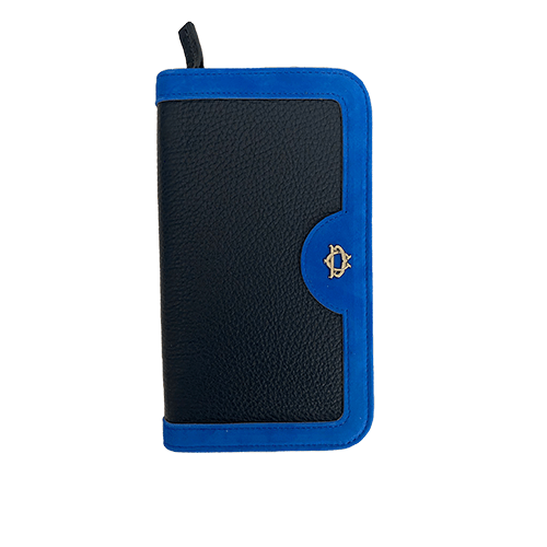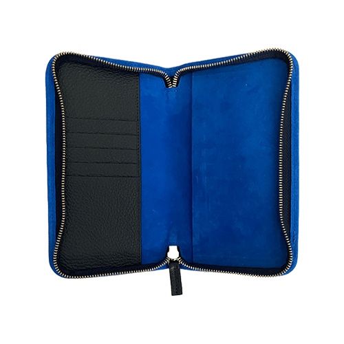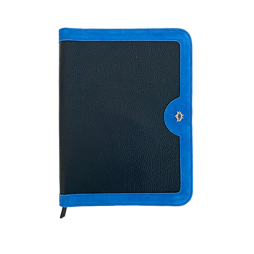 Agenda Business settimanale e blocco note con custodia in pelle pregiata e camoscio, dotata di doppia lampo nel colore blu scuro/camoscio blu chiaro. Attrezzata con un raffinato portaocchiali estraibile in camoscio, porta tablet e tasche portadocumenti.