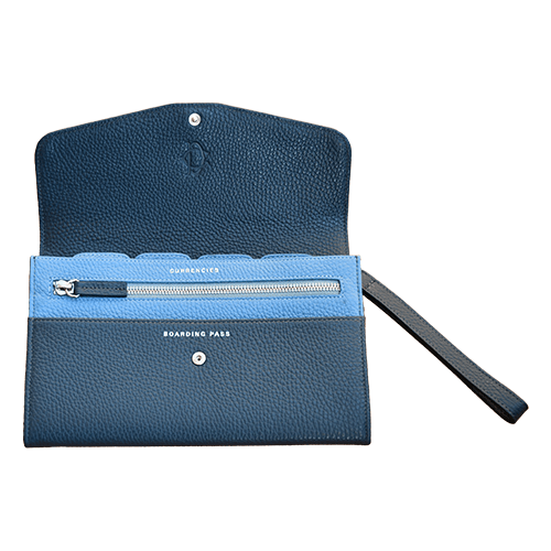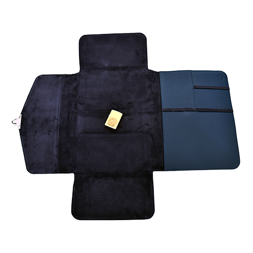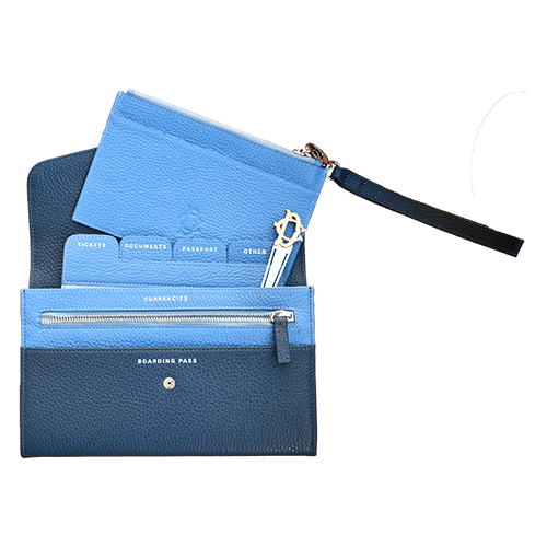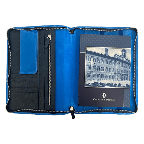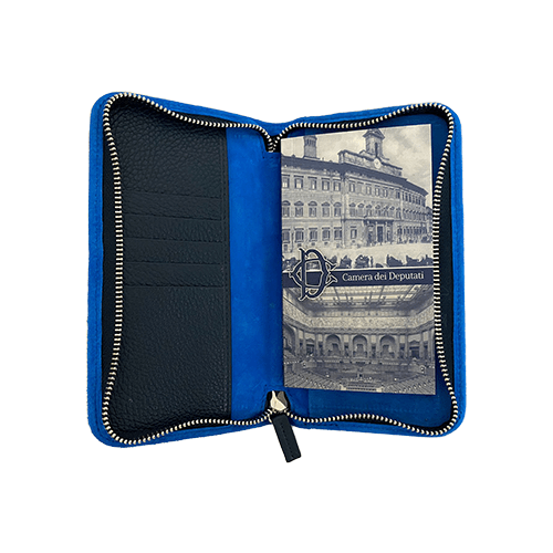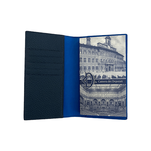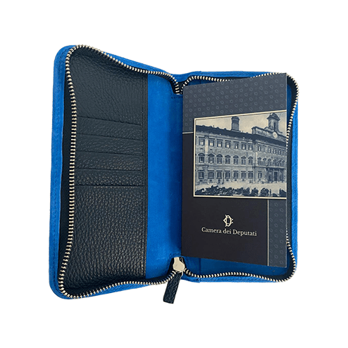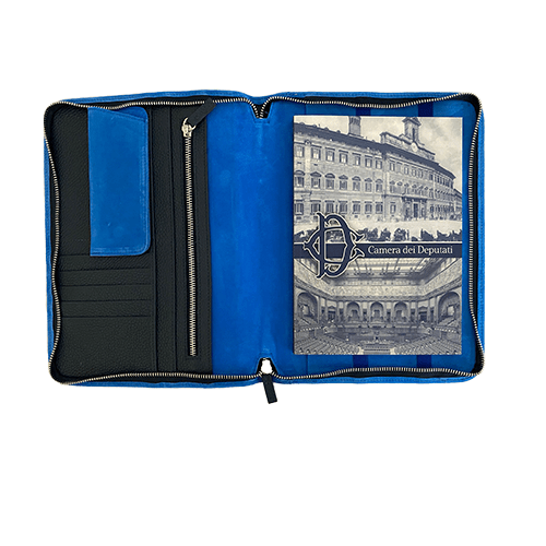 Il Portadocumenti Camera dei Deputati, è realizzato in pelle bicolore blu chiaro/blu scuro. Ideato per avere sempre a portata di mano tutti i documenti da viaggio, esso è suddiviso in scomparti con pratiche tasche etichettate, di cui una dotata di zip metallica di sicurezza, per contenere il passaporto e altri documenti, i biglietti, le banconote e il cellulare o altri oggetti personali. Inoltre, è dotato di un comodo portamonete estraibile e autonomo.