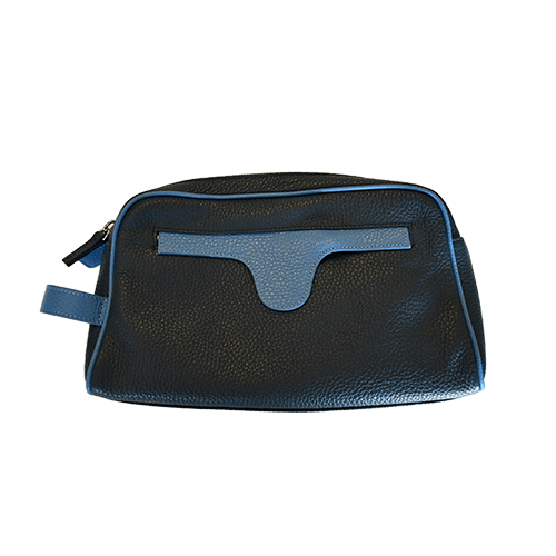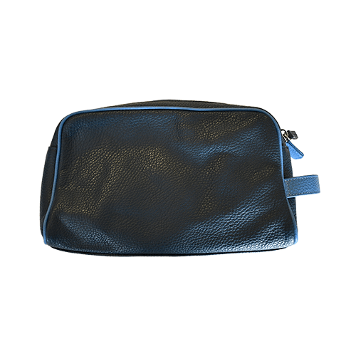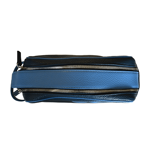 Beauty da viaggio con manico, doppia lampo in metallo e tasca esterna con lampo. Realizzato in pelle pregiata nel colore blu chiaro/blu scuro.