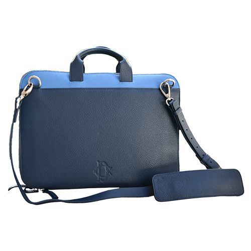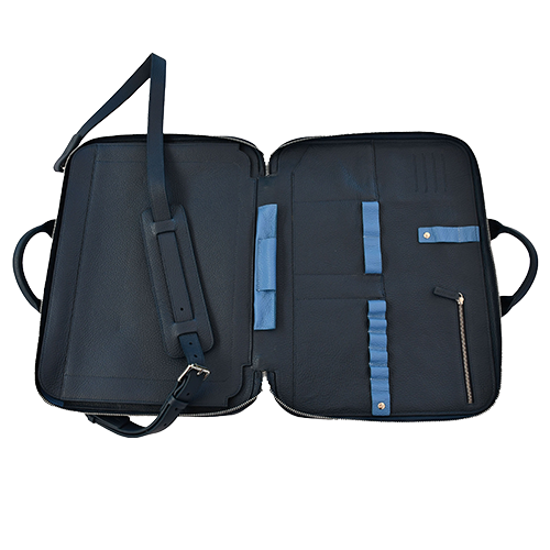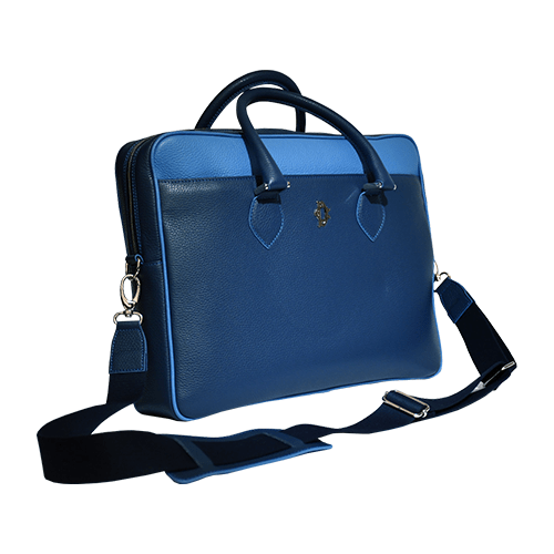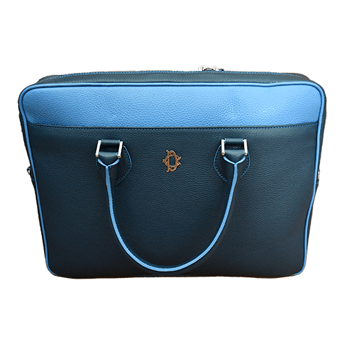 Capiente e compatta Borsa da Lavoro realizzata in pelle pregiata nel colore blu chiaro/blu scuro. La borsa è internamente foderata e attrezzata con pratiche tasche interne ed esterne e scomparti, di cui uno per l’alloggiamento del tablet, per riporre in modo ordinato documenti e oggetti vari, rifinita con un’ampia lampo metallica di sicurezza per avere facilmente a portata di mano tutto ciò che serve. La Borsa da Lavoro ha in dotazione anche una comoda tracolla ed è perfettamente sovrapponibile, tramite una fascia elastica, al trolley da viaggio.