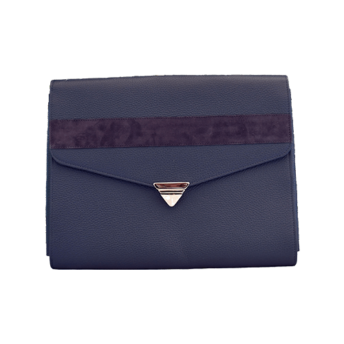 Cartella portadocumenti in pelle e camoscio con tuc esterno in metallo argentato. Attrezzata con tasche e alloggiamento per varie tipologie di documenti. Colore blu chiaro/blu scuro.
