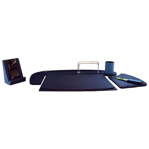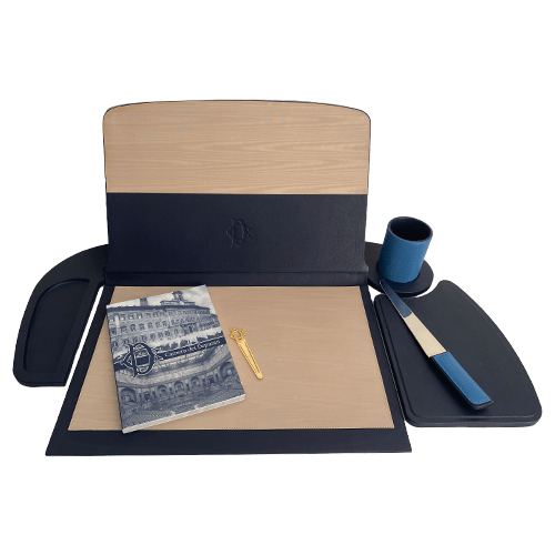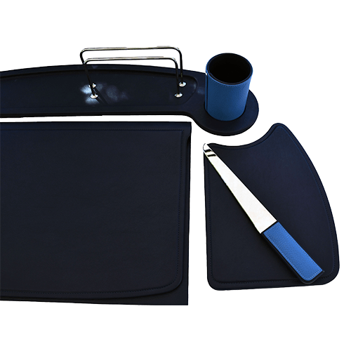 Set da scrivania direzionale composto da 6 pezzi, realizzato in pelle pregiata. Colore blu chiaro/blu scuro.